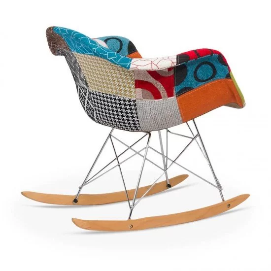 Scaunul balansoar patchwork BUC 243B este sustinut de un cadru de otel cromat si de 2 suporturi din lemn.