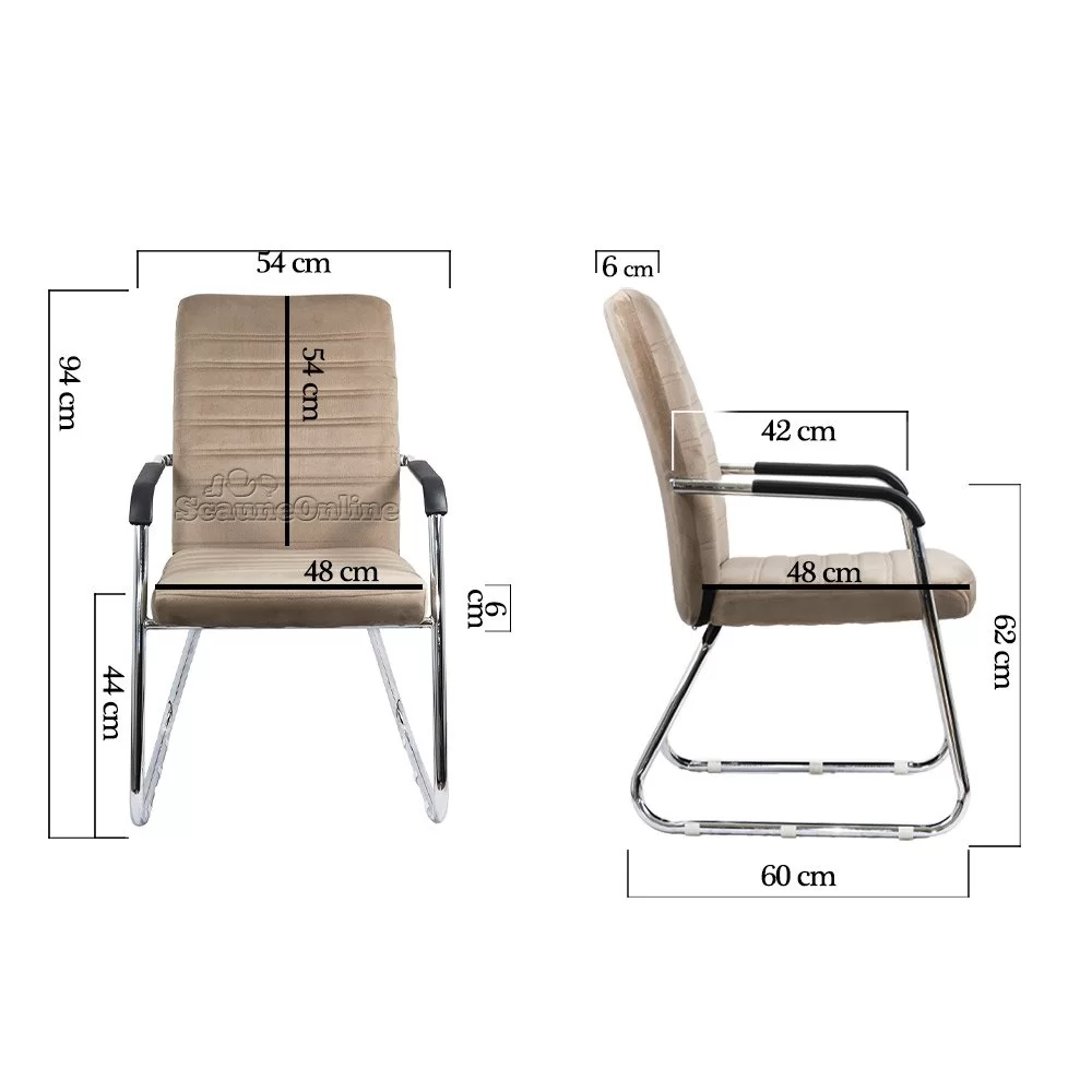 Designul său ingenios, cu un cadru metalic cromat, asigură stabilitate și durabilitate, în timp ce tapiteria din catifea moale oferă o notă de lux și confort. Spătarul și șezutul sunt susținute de un burete de înaltă densitate, garantând o susținere fermă, dar plăcută pe durata așteptării.