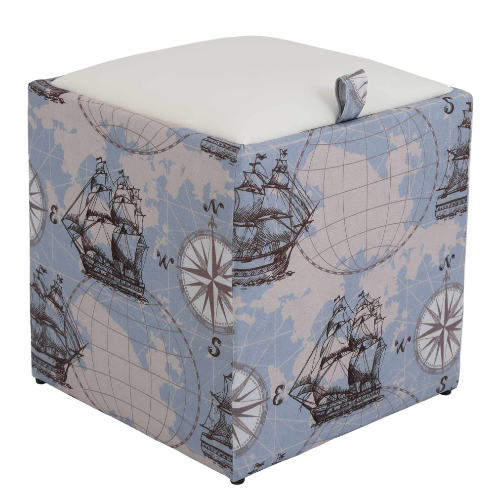 Taburet Box - stofa print corabii bleu/imitatie piele alb